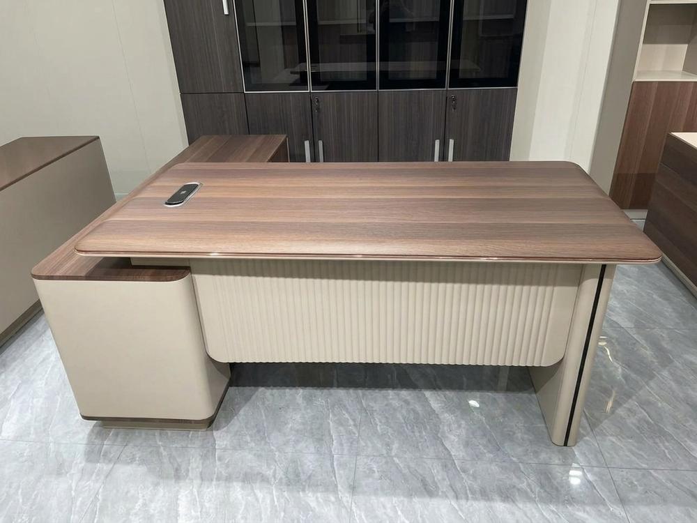 Premium Walnut Wood Executive L-Shaped Desk with Fluted Cream Base